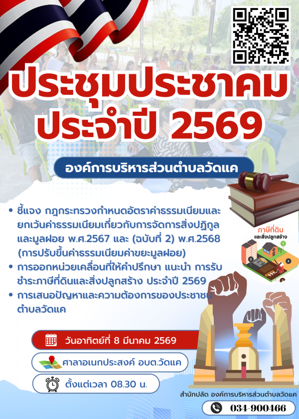 ขอเชิญประชาชนตำบลวัดแค หมู่ที่ 3-4 เข้าร่วมประชุมประชาคม ประจำปี 2569