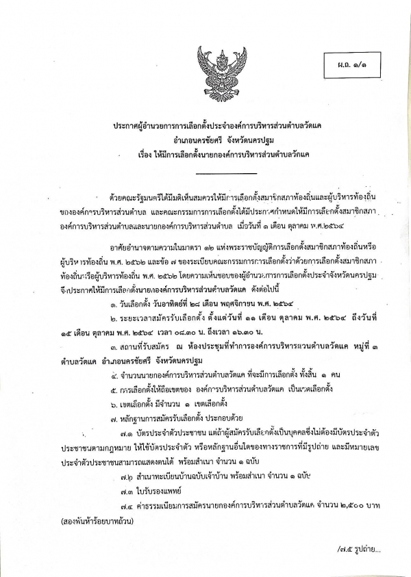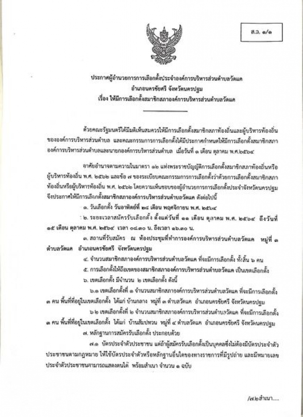 ประกาศผู้อำนวยการการเลือกตั้งประจำองค์การบริหารส่วนตำบลวัดแค ให้มีการเลือกตั้งสมาชิกสภาองค์การบริหารส่วนตำบลวัดแค และนายกองค์การบริหารส่วนตำบลวัดแค