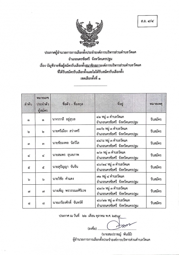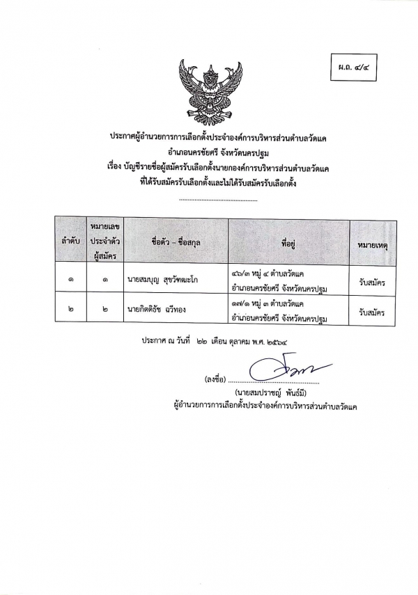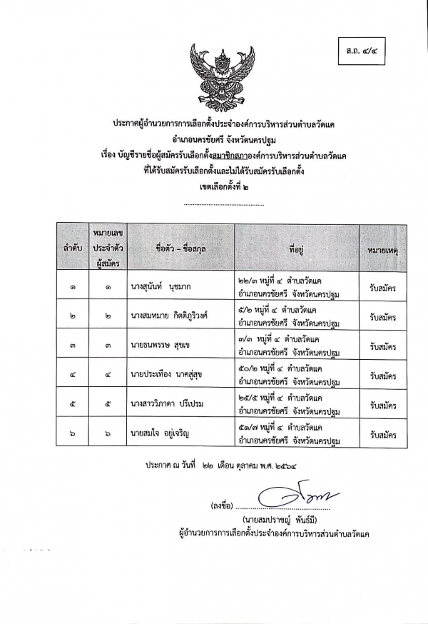 เรื่อง บัญชีรายชื่อผู้สมัครรับเลือกตั้งนายกองค์การบริหารส่วนตำบลวัดแคและสมาชิกองค์การบริหารส่วนตำบลวัดแค ที่ได้รับสมัครรับเลือกตั้งและไม่ได้รับสมัครรับเลือกตั้ง