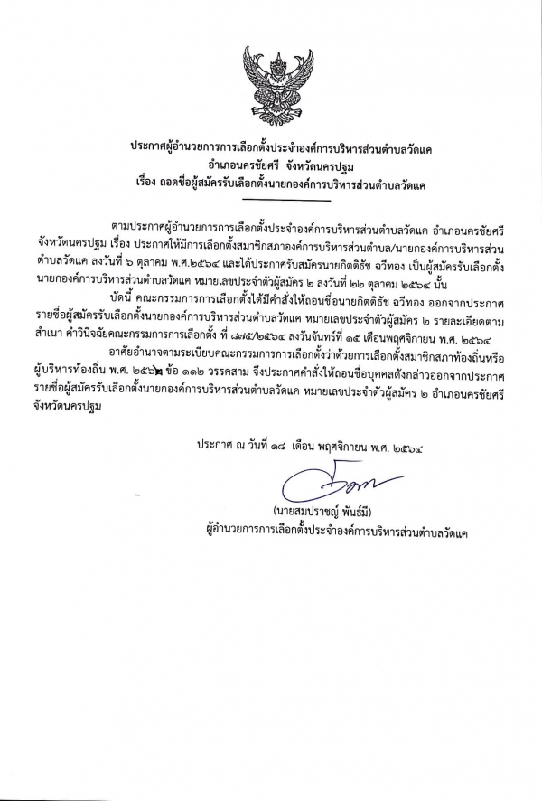 ประกาศผู้อำนวยการการเลือกตั้งฯ เรื่อง ถอดชื่อผู้สมัครรับเลือกตั้งนายกองค์การบริหารส่วนตำบลวัดแค