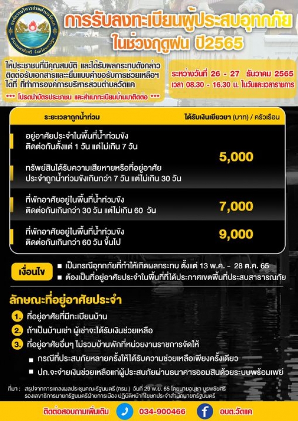 หากผู้ประสบอุทกภัยรายใด เข้าหลักเกณฑ์เงื่อนไขดังกล่าว ให้ติดต่อรับเอกสาร และยื่นคำร้องขอรับความช่วยเหลือได้ที่ ที่ทำการองค์การบริหารส่วนตำบลวัดแค (โปรดนำบัตรประชาชนและสำเนาทะเบียนบ้านมาติดต่อ) ตั้งแต่วันที่ 26-27 ธันวาคม 2565 ในเวลาราชการ