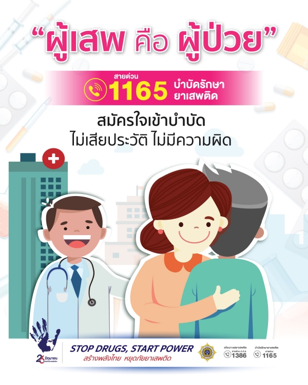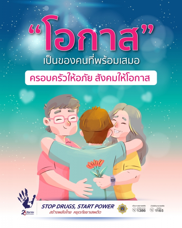 · “โอกาส” เป็นของคนที่พร้อมเสมอ ครอบครัวให้อภัย สังคมให้โอกาส เนื่องในวันต่อต้านยาเสพติดโลก (26 มิถุนายน) ขอเชิญชวนผู้เสพ/ผู้ติดยาเสพติดเข้ารับการบำบัดรักษา ไม่เสียประวัติ ไม่มีความผิด สายด่วนบำบัดยาเสพติด โทร. 1165