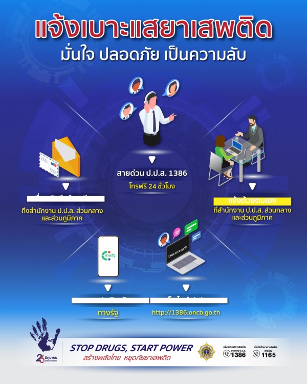 หากพบเบาะแสยาเสพติด แจ้งสายด่วน ป.ป.ส. โทร. 1386