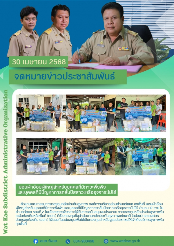 ตัวแทนคณะกรรมการกองทุนหลักประกันสุขภาพ องค์การบริหารส่วนตำบลวัดแค ลงพื้นที่ มอบผ้าอ้อมผู้ใหญ่สำหรับบุคคลที่มีภาวะพึ่งพิง และบุคคลที่มีปัญหาการกลั้นปัสสาวะหรืออุจจาระไม่ได้ จำนวน 12 ราย ในตำบลวัดแค รอบที่ 2 โดยโครงการดังกล่าวได้รับการสนับสนุนงบประมาณ จากกองทุนหลักประกันสุขภาพในระดับท้องถิ่นหรือพื้นที่ (กปท.) ที่เป็นกองทุนซึ่งสำนักงานหลักประกันสุขภาพแห่งชาติ (สปสช.) และองค์กรปกครองท้องถิ่น (อปท.) ได้ร่วมกันสนับสนุนเพื่อใช้เป็นกองทุนสำหรับดูแลประชาชนให้เข้าถึงบริการสุขภาพในทุกพื้นที่