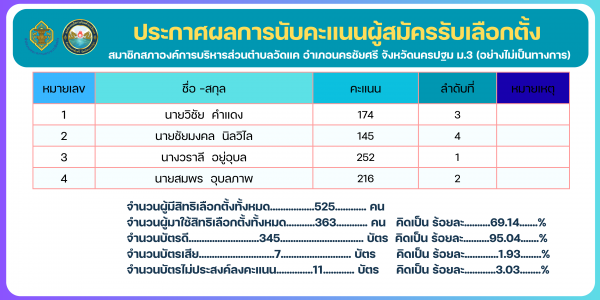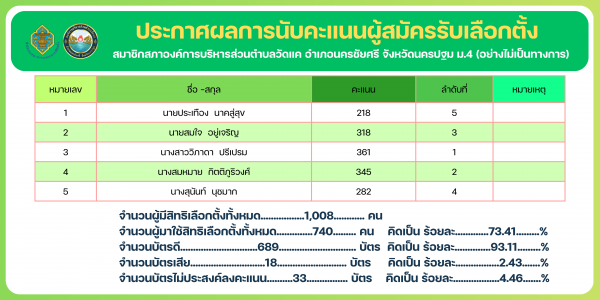 เรื่อง ผลการรวมคะแนนเลือกตั้งสมาชิกสภาองค์การบริหารส่วนตำบลวัดแคและนายกองค์การบริหารส่วนตำบลวัดแค